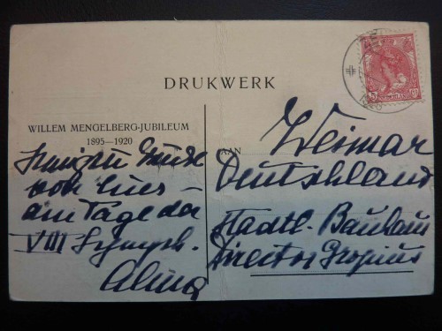 1920. Gustav Mahler Festival Amsterdam 1920. Postcard Alma Mahler (1879-1964) to Walter Gropius (1883-1969) in Weimar. About Symphony No. 8 (21-05-1920).