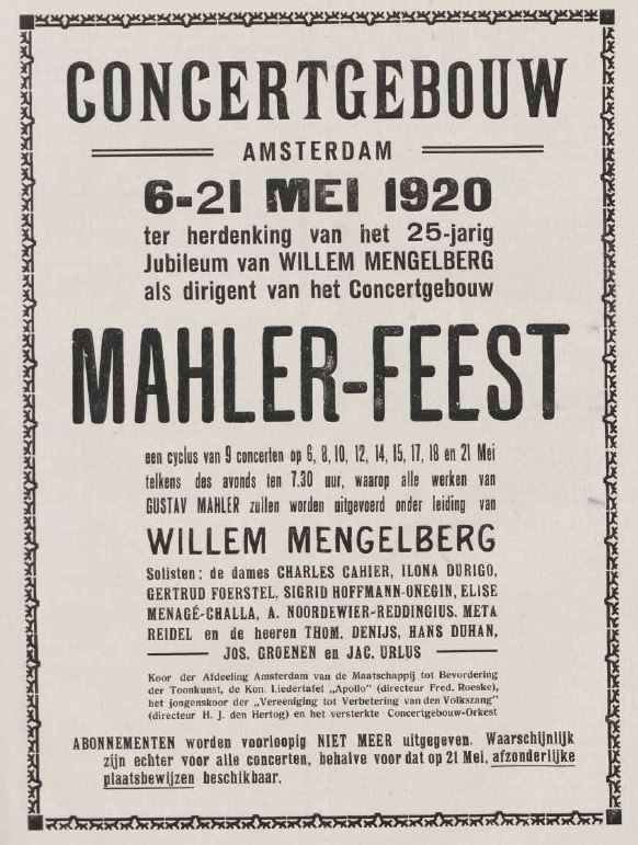 - 10-05-1920 Amsterdam: Amsterdam Royal Concertgebouw. Monday. Symphony No. 3. Meta Reidel (alto). Accessible to the general public.