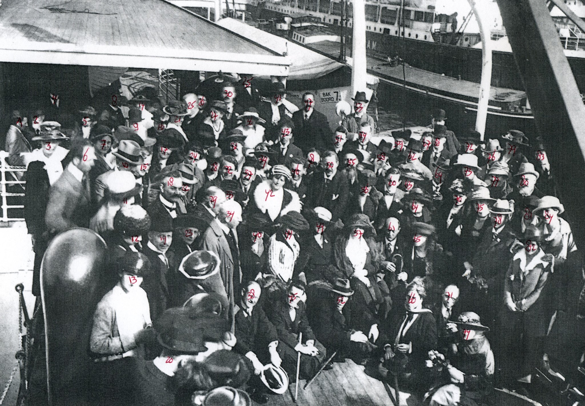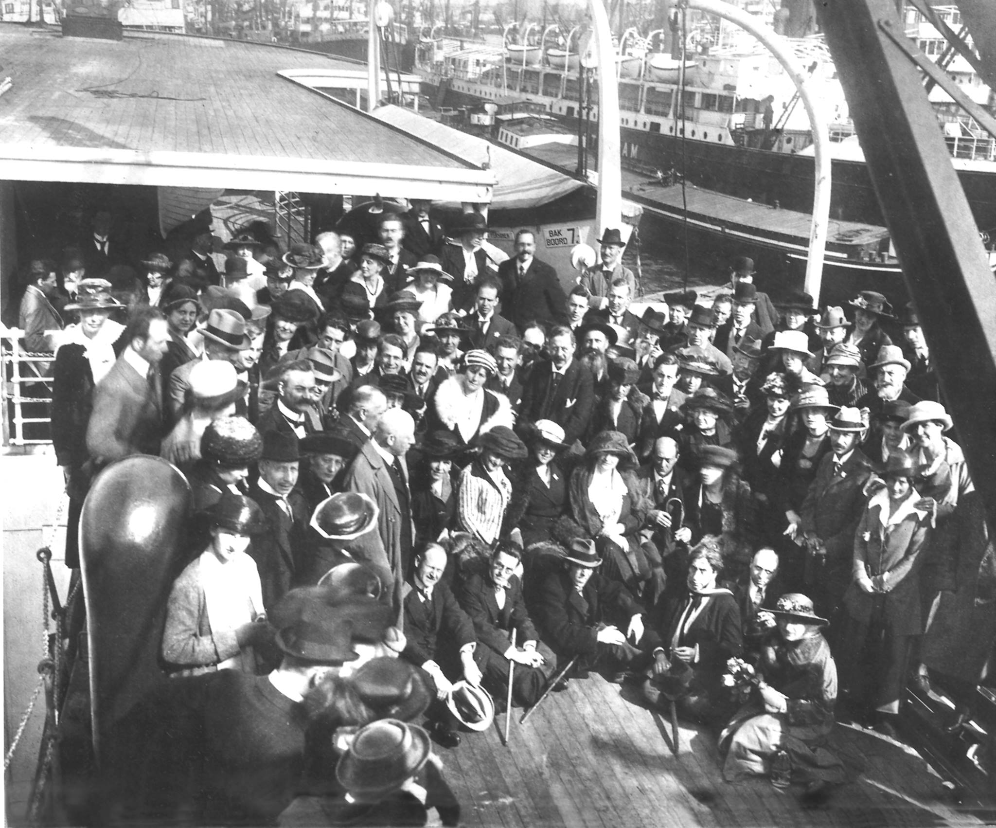 13-05-1920. Gustav Mahler Festival Amsterdam 2020: Gertrude Foerstel (in striped dress), Mathilde Mengelberg-Wubbe (1875-1943) (white hat), Alma Mahler (1879-1964) (dark hat with dark scarf), Arnold Schoenberg (1874-1951) (dark hat, pin and umbrella), Mathilde Schoenberg. In front: Alexander Schmuller (1880-1933). S.S. Jan Pieterszoon Coen.