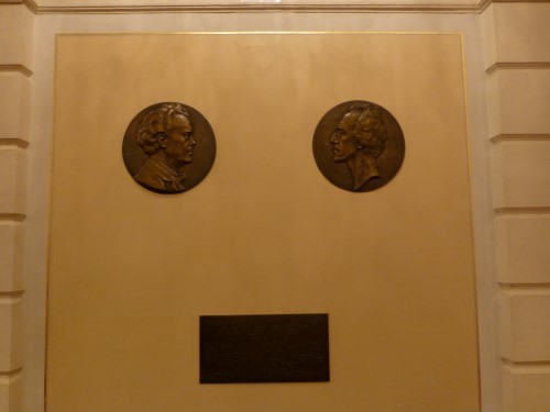 21-05-1920. Gustav Mahler Festival Amsterdam 1920. Memorial plaque group of three. Location: Amsterdam Royal Concertgebouw, large hall, near entrance left, front of stage. After a speech by Hendrik Freijer (1876-1955), two plaques designed by sculptor Toon Dupuis (1877-1937) (and executed by the firm Begeer) were unveiled with the effigies of Mahler and Mengelberg.