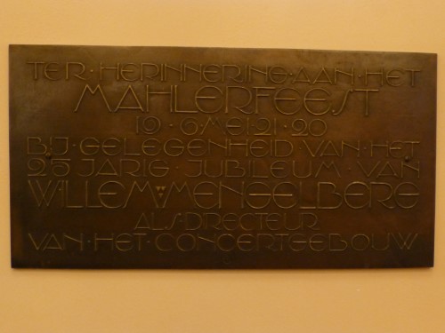 21-05-1920. Gustav Mahler Festival Amsterdam 1920. Royal Concertgebouw, City of Amsterdam, the Netherlands. Memorial plaque 3. Translation from Dutch: “In memory of the Mahler Festival 19.6may21.20 on the occasion of the 25th anniversary of Willem Mengelberg (1871-1951) as director of the Royal Concertgebouw“.