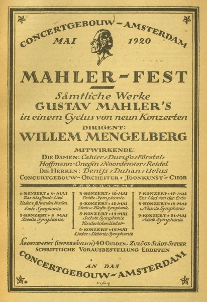 1920. Gustav Mahler Festival Amsterdam 1920. Program book, Amsterdam, the Netherlands. Translation from Dutch: “Royal Concertgebouw, Amsterdam, Mahler Feest (Fest, Festival) from may 6 until may 21 1920. To mark the 25th anniversary of Willem Mengelberg (1871-1951) as conductor of the Royal Concertgebouw Orchestra (RCO/KCO)“.