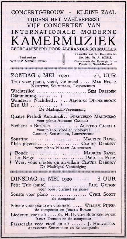 - 19-05-1920 Amsterdam: Amsterdam Royal Concertgebouw. Wednesday. In the evening fourth concert of “International Chambermusic festival during the Mahler Festival”. Five concerts organised by Alexander Schmuller (1880-1933). Small hall.