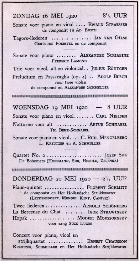 16-05-1920, 19-05-1920 and 20-05-1920. Gustav Mahler Festival Amsterdam 1920. Gustav Mahler Festival Amsterdam 1920. “International Chambermusic festival during the Mahler Festival”. Concerts organised by Alexander Schmuller (1880-1933). Small hall. Julius Rontgen (1855-1932), Carl Nielsen (1865-1931), Rudolf Mengelberg (1892-1959), Arnold Schoenberg (1874-1951), Amedee-Ernest Chausson (1855-1899).
