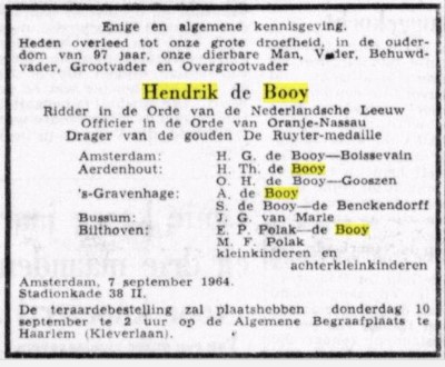 09-09-1964 Obituary Hendrik (Han Henri) de Booy (1867-1964).