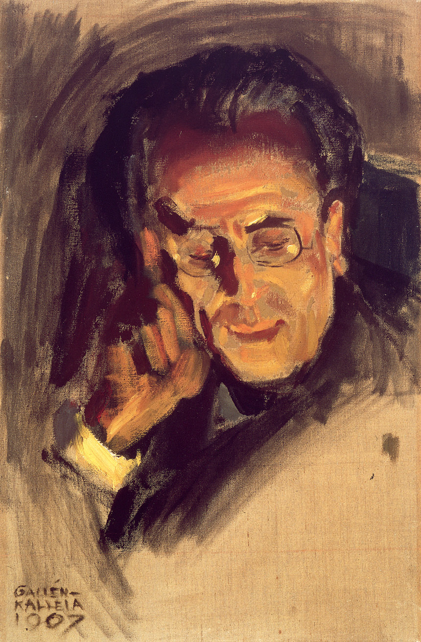 Year 1907. Gustav Mahler. Oil paining by Akseli Gallen-Kallela. Just after this painting was completed, Mahler wrote about it to his wife, Alma: ‘When it got dusk, we sat in the twilight in front of the open fire, where huge logs blazed and glowed as though in a smithy. Gallen, who had kept his eyes fixed on me throughout the trip in the most singular way (as if he’d spottted a hare), suddenly set up an easel and began on my portrait. Lit up only by fire, quite a la Rembrandt…. An hour passed: I had to go and was just bidding them all farewell when my host brought the easel along and there, to the wonder of all, was my portrait – completely finished. Very fine as a painting and also a strong likeness. You would be astonished!’.