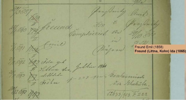 - Wife: Ida Freund Kohn (Littna) (1865-1943). Born 08-03-1865 Prague, murdered in 1943 Treblinka, Poland. Aged 77. She was first married to Friedrich Kohn (1885-1889, died aged 34) and later to Emil Freund. She had a son Heinrich Freund (1887-1942) with Friedrich Kohn. Emil Freund was Friedrich Kohn’s stepfather. At 09-04-1906 Heinrich added the name Freund to his official name. He is murdered in Poland, aged 54.