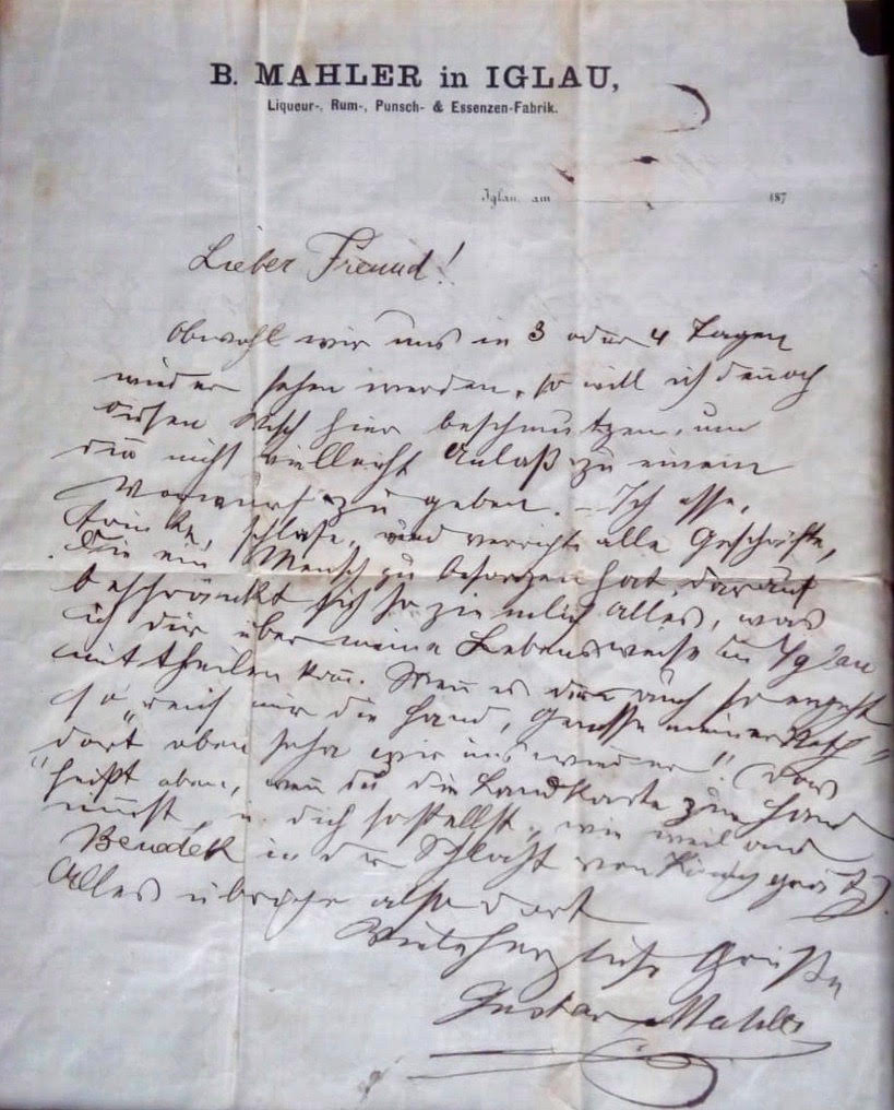 1860-1875. Letter by Gustav Mahler (1860-1911) to Emil Freund (1858-1928), written on Bernard Mahler (1827-1889)’s letterhead, in which he invites his friend to Jihlava (Iglau) for vacation but making sure he knows that there’s not to much to do there.
