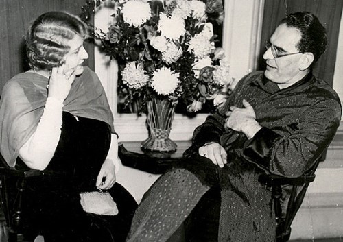 1948. Alma Mahler (1879-1964) and Eugene Ormandy (1899-1985). After a performance of Mahler Symphony No. 8 at the Hollywood Bowl, 07-1948.