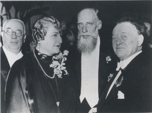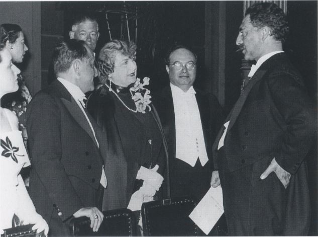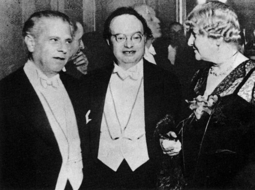 1948. Eugene Ormandy (1899-1985), Alma Mahler (1879-1964) and Thomas Mann (1875-1955). After a performance of Mahler Symphony No. 8 at the Hollywood Bowl, 07-1948.