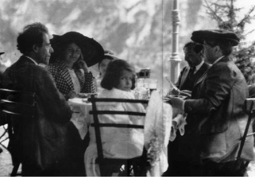 Year 1910. Gustav Mahler (1860-1911), Alma Mahler (1879-1964), Maria Eberstaller-Moll (1899-1945), Anna Justine Mahler (Gucki) (1904-1988) (up front), Oskar Fried (1871-1941) and Anna Sofie Moll-Schindler-Bergen (1857-1938). Pragser Wildsee near Toblach.