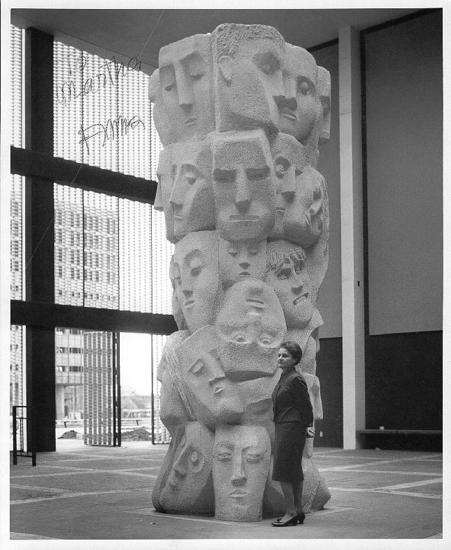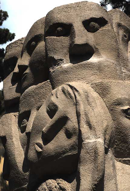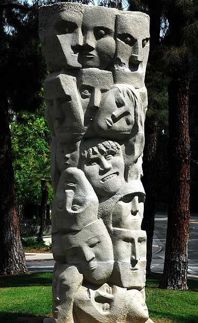 1961. Anna Justine Mahler (Gucki) (1904-1988). Tower of masks. Murphy Sculpture Garden at UCLA. "Tower of Masks" is one of two sculptures at UCLA designed by Anna Mahler. The piece, which was created in 1961, was the gift of Anna Bing Arnold an sits just outside the east perimeter of the Murphy Sculpture Garden, between the Ruskin School of Public Affairs and MacGowan Hall.