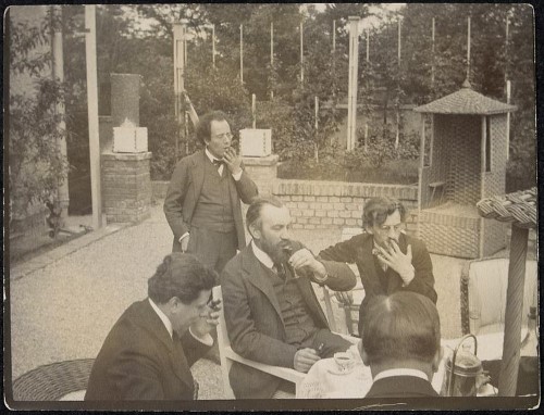 55. 1905. Vienna. A gathering in the garden at the villa of the painter Carl Julius Rudolf Moll (1861-1945). From left to right: Mahler, the well-known director Max Reinhardt (1873-1943) (at the back), Mahlers step father in law Carl Julius Rudolf Moll (1861-1945) (center) and composer Hans Pfitzner (1869-1949) (right).