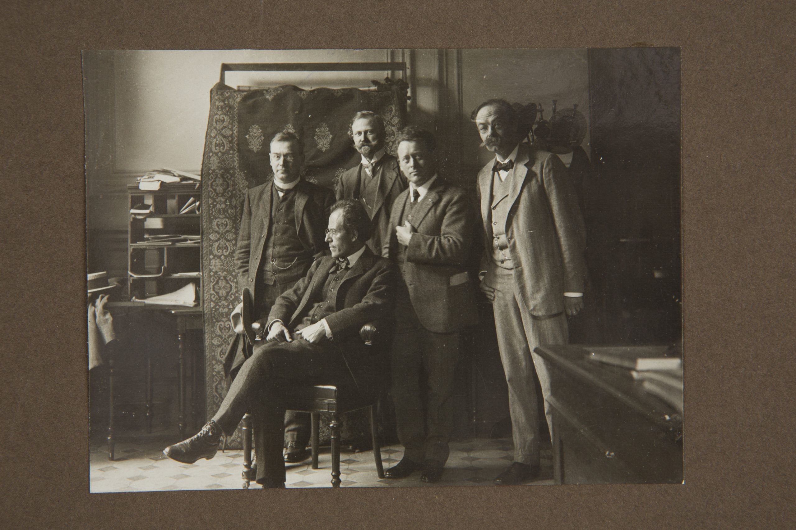 113. 1909. Amsterdam. Concertgebouw. Gustav Mahler (1860-1911) with Dutch colleagues: From left to right: Cornelis Dopper (1870-1939) (second conductor of the Royal Concertgebouw Orchestra (RCO)), Gustav Mahler (1860-1911), Hendrik Freijer (1876-1955) (administrator of the Royal Concertgebouw Orchestra (RCO)), Willem Mengelberg (1871-1951) (principal conductor of the Royal Concertgebouw Orchestra (RCO)) and Alphons Diepenbrock (1862-1921) (composer). Photographer: W.A. van Leer for “Weekblad voor muziek”. The Netherlands.