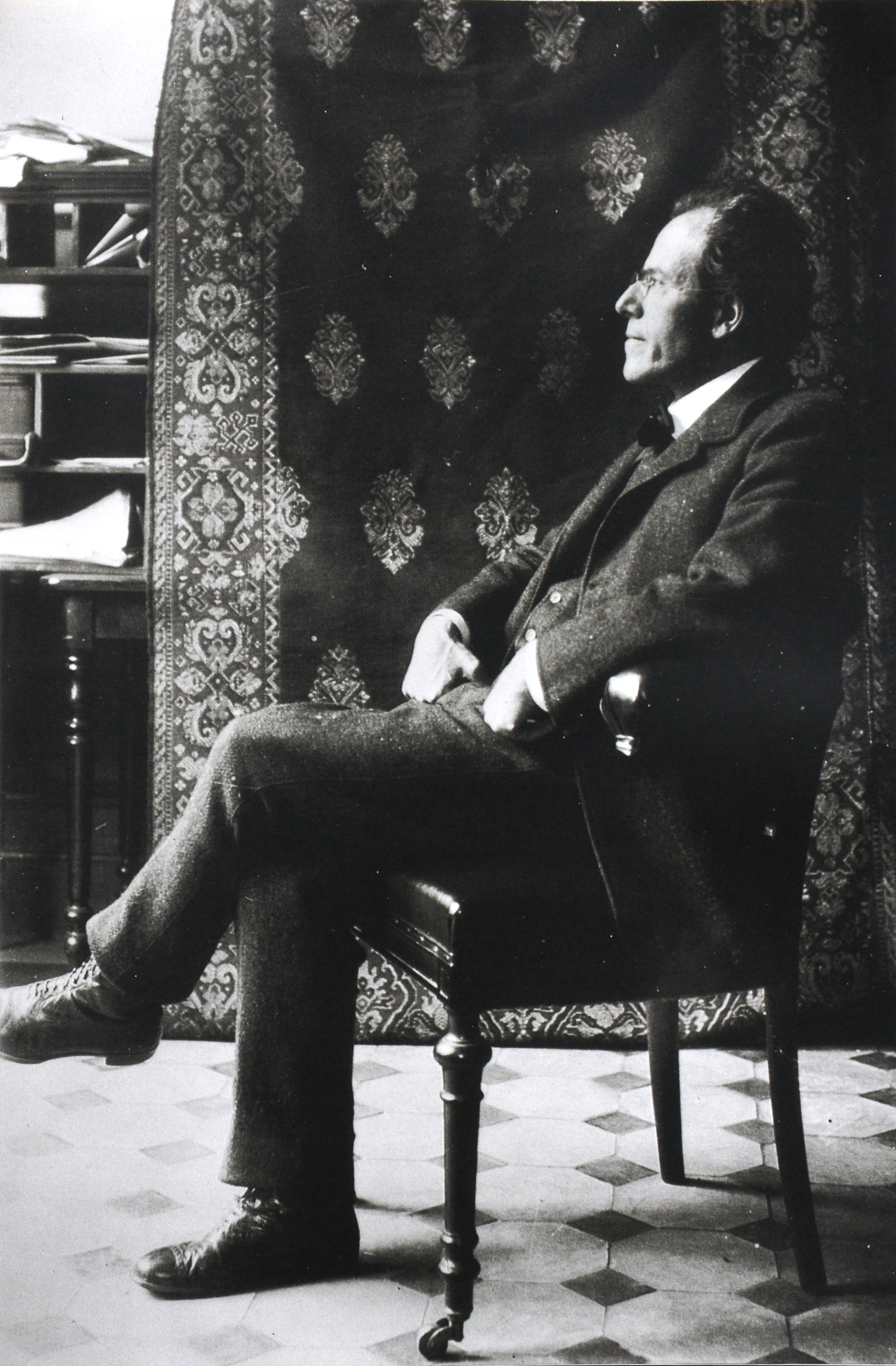 110. 1909. Amsterdam. This photo was made on 07-10-1909 by N.H. Wolf (Chief editor of ‘De Kunst’ magazine) in House Willem Mengelberg. Published on 09-10-1909 in ‘De Kunst’ magazine. Gustav Mahler (1860-1911) visited the Netherlands at the invitation of Willem Mengelberg (1871-1951) to conduct the Dutch premiere of his Symphony No. 7 with the Royal Concertgebouw Orchestra (RCO) in Amsterdam and in The Hague. His daughter Anna Justine Mahler (Gucki) (1904-1988), who was only seven years when Mahler died, recalled some 60 years later that this photograph was “Mahler as I knew him when I was a child: relaxed, delicate, good-humored, infinitely intelligent and understanding”.