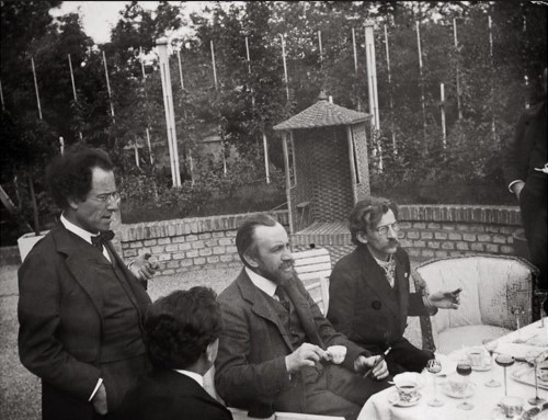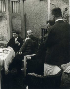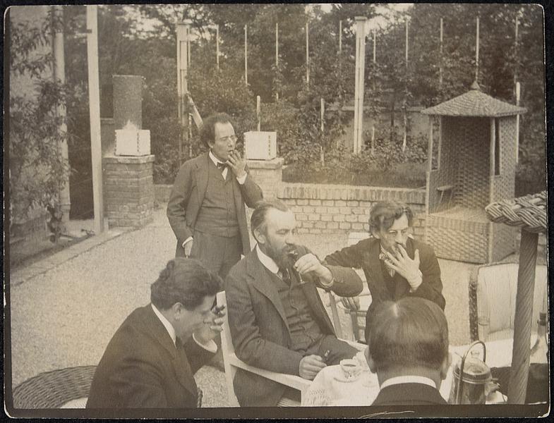Year 1905. Vienna. Garden House Carl Moll I Vienna - Steinfeldgasse No. 8. Max Reinhardt (1873-1943), Gustav Mahler (1860-1911), Carl Julius Rudolf Moll (1861-1945), Hans Pfitzner (1869-1949) and Josef Hoffmann (1870-1956) (his back to the camera).