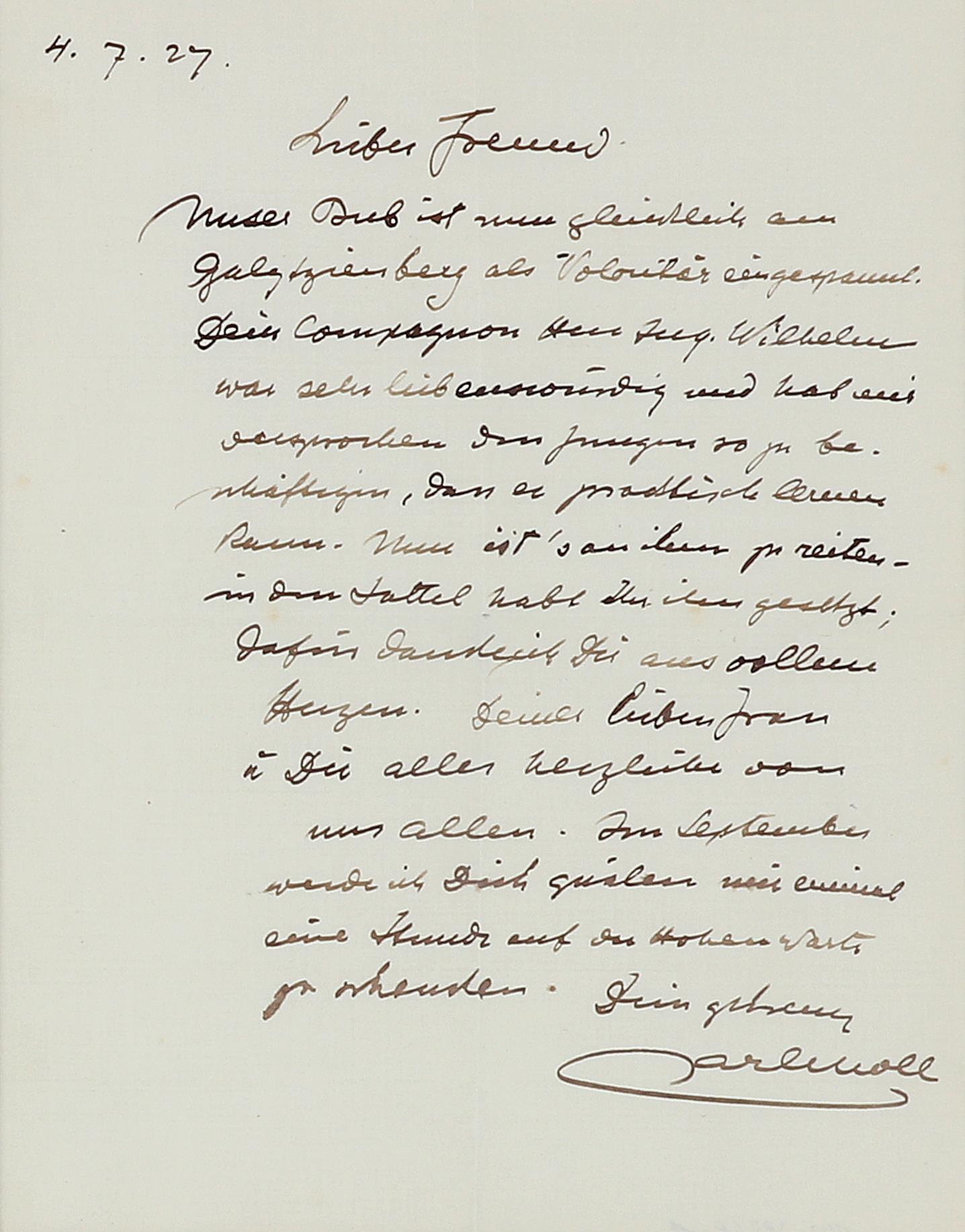 04-07-1927 Letter by Carl Julius Rudolf Moll (1861-1945) probably about Wilhelm (Willy) Carl Emil Legler (1902-1960). "Lieber Freund. Unser Bub ist nun glücklich am Galitzinberg als Volontär eingespannt. Dein Compagnon Herr Ing. Wilhelm war sehr liebenswürdig und hat mir versprochen den Jungen so zu beschäftigen, dass er praktisch lernen kann. Nun ist's an ihm zu reiten - in den Sattel habt ihr ihn gesetzt; dafür danke ich Dir aus vollem Herzen. Deiner lieben Frau und Dir alles herzliche von uns allen. Im September werde ich Dich quälen mir einmal eine Stunde auf der Hohen Warte zu schenken. Dein getreuer Carl Moll". Carl Moll and the Nazis Carl Julius Rudolf Moll (1861-1945) had a daughter Maria Eberstaller-Moll (1899-1945). She was married to a Nazi Richard Eberstaller (1887-1945) who was the vice president of the Nazi Court in Vienna from 1938 to 1945. He made Carl Moll support the Nazis after Hitler seized power in Germany. In a letter to Carl Moll Alma Mahler (1879-1964) praised Hitler as the "great organizer". Carl Moll was never a party member. His daughter Maria Eberstaller-Moll (1899-1945) and son-in-law Richard Eberstaller (1887-1945) were.