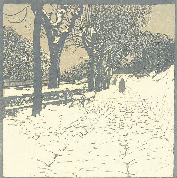 Year 1903. Carl Julius Rudolf Moll (1861-1945). "Winter (Hohe Warte in Vienna)". Woodcut in colors. See: Hohe Warte district map.