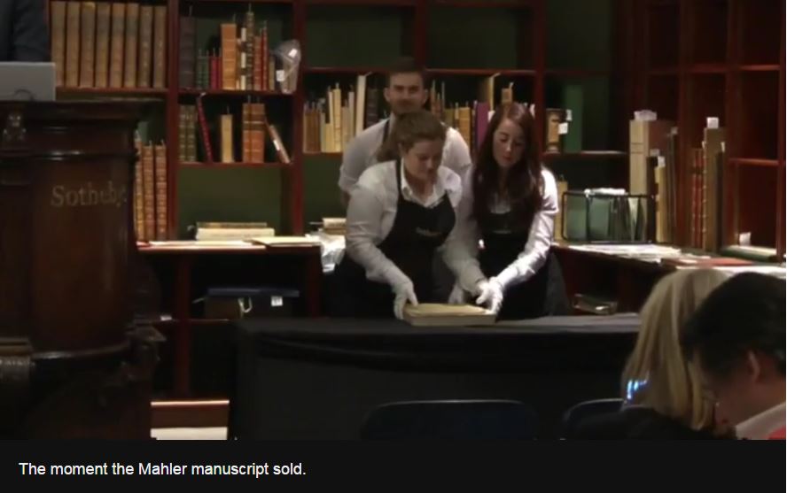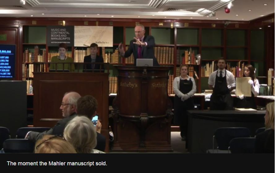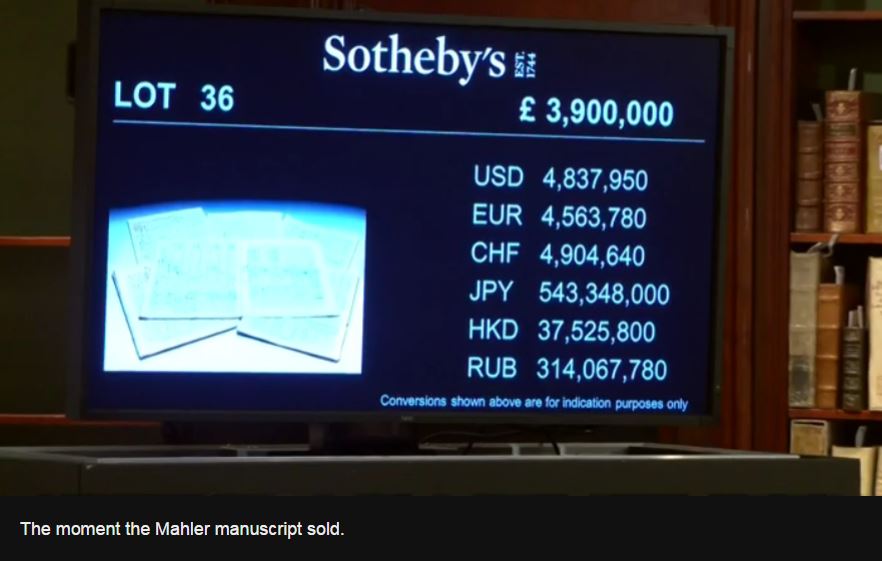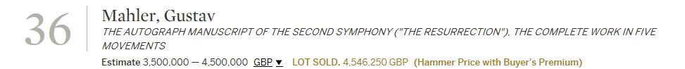 - 29-11-2016 London: The hammer price for the original manuscript of Mahler’s Second Symphony was £3.9m. The added Sotheby’s premium brought the total to £4,546,250. There were four telephone bidders. The only comparable handwritten music manuscripts of major symphonic works to have been sold at auction include the manuscript of nine Mozart symphonies – which fetched £2.5m in 1987. The manuscript of Robert Schumann’s Second Symphony sold for £1.5m in 1994.
