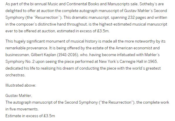 - 13-11-2016 London: Sotheby’s catalogue text: Sotheby’s, Music and Continental Books and Manuscripts, London | 29 Nov 2016, 10:30 AM | L16406: LOT 36, MAHLER, GUSTAV, THE AUTOGRAPH MANUSCRIPT OF THE SECOND SYMPHONY (“THE RESURRECTION”), THE COMPLETE WORK IN FIVE MOVEMENTS