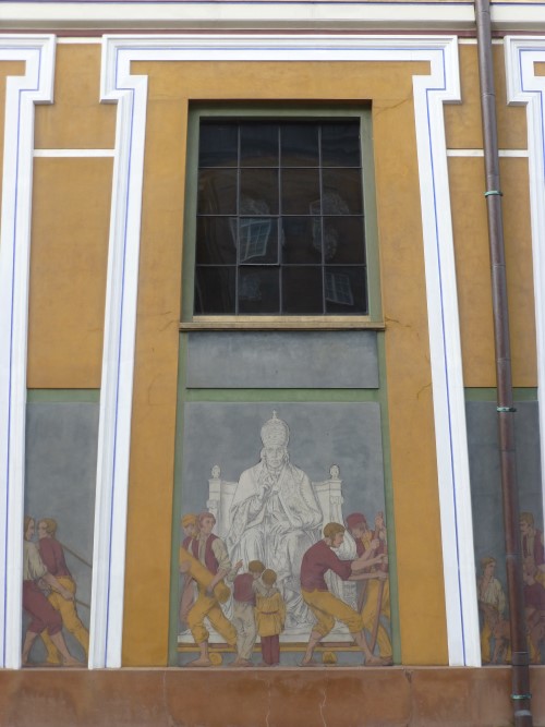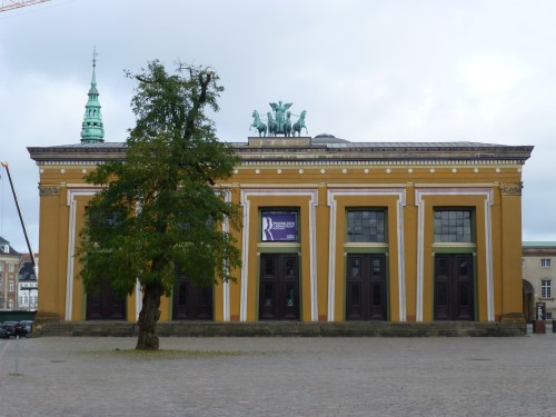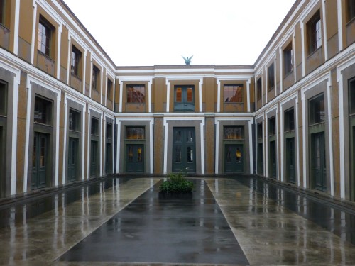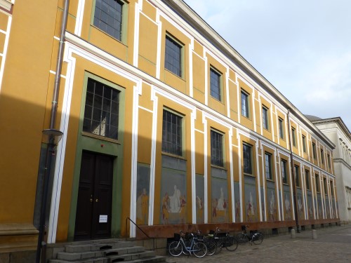 The building is strongly inspired by antique Greek architecture and built around an inner courtyard where the artist is buried. The courtyard is particularlarly notable being painted in Eqyptian motifs, tall date palms, lions and crocodile prowl among exotic birds and plants. The Egyptian influence on the exterior is more chaste, here enormous doors in severe trapezoidal style define the architect’s intentions to pay homage at once to Attic Greek, Pompeiian and Egyptian style. It is particularly noteworthy for its unique use of colors both inside and outside. Every room in the museum has a unique ceiling decoration in the grotesque style. The outside is adorned with a frieze depicting Thorvaldsen’s homecoming from Rome in 1838 made by Jørgen Sonne.