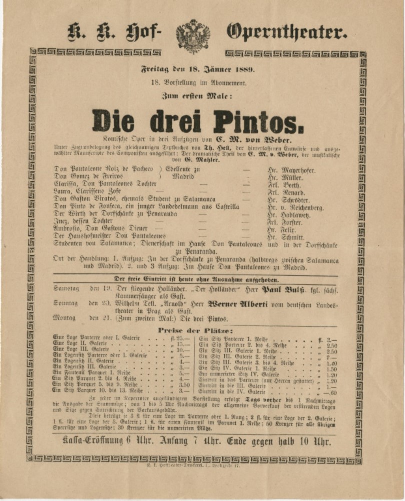 - 1889 Opera Vienna 18-01-1889 Die drei Pintos. Vienna premiere.´Comic opera in three parts´, 18th subscription concert of the Vienna State Opera. Gustav Mahler himself is in Budapest. Year 1889.