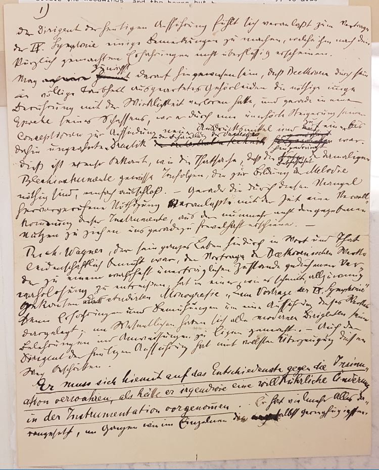 Transcription Beethoven Symphony No. 9, two-page draft of Mahler’s note justifying his Retouchen to Beethoven’s Ninth Symphony. Written after the reviews of the first performance (18-02-1900) for distribution at the second (22-02-1900).