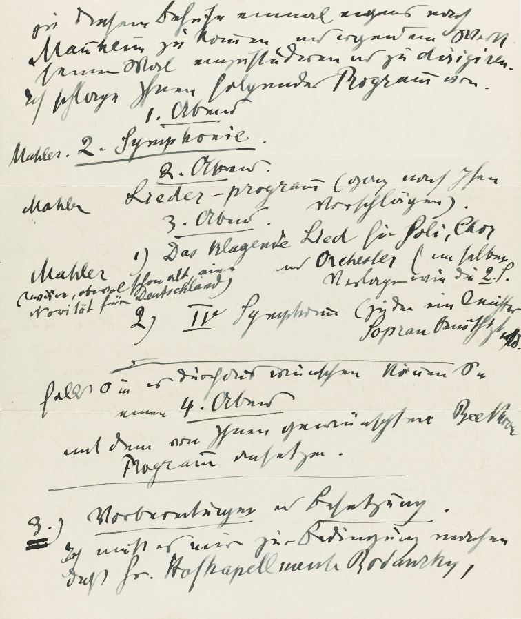 apologizing for replying in telegraph-style, since he is exhausted, organizing his reply under four numbered headings, concerning the date, the concert programme, the preparations and performers and lastly his fee, informing him that he will be at his disposal between 8 and 30 May, and that he must be in Vienna at the latest by 1 June, noting that he is so exhaustingly busy here that he will not be able to take on a theatrical work with all the necessary rehearsals, explaining that he is however prepared to conduct in Mannheim, outlining a suggested programme, consisting of three nights of his own works, including the Symphony No.2, Das klagende Lied and the Symphony No.4, offering the possibility of a fourth evening concert consisting of works by Beethoven, insisting that Hofkapellmeister Bodanzky prepare the orchestra, choir and soloists for his works very carefully, asking that Dr. Kraus be excluded from participation, since he has so far shown no interest in his works, and is obviously not favourably disposed towards them, asking that the other suggested names, which are unknown to him, be left entirely to his friend Bodanzky, recommending [Friedrich] Weidemann, [Richard] Mayr as excellent interpreters of his songs, and also [Fritz] Vogelstrom for some songs and the tenor part in Das klagende Lied, suggesting which songs could be sung at the Liederabend, namely those from three volumes published by Schott, and from Des Knaben Wunderhorn published by Weinberger, also mentioning the Rückert-Lieder, published by Kahnt, and ‘Reveille’ from Des Knaben Wunderhorn, and accepting without discussion the suggested fee; in a closing paragraph, Mahler asks to be recommended most cordially to the director Dr. Hagemann, whose acquaintance he is particularly looking forward to making, requests that he send his friend Bodanzky his best regards, and that he answer as speedily as possible since he has many arrangements to make