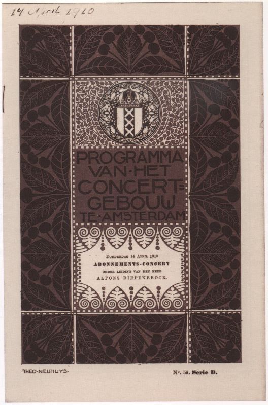 Year 1910. 14-04-1910 Program Alphons Diepenbrock (1862-1921) performance Symphony No. 4. Amsterdam Royal Concertgebouw Orchestra (RCO), Amsterdam Royal Concertgebouw.