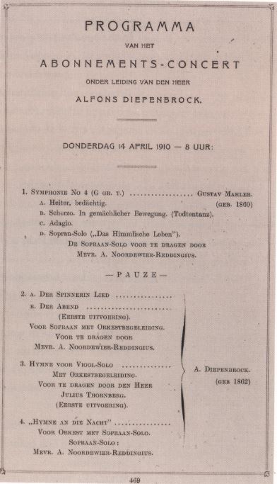 For the last time, on 14-04-1910 Diepenbrock conducted Mahler’s Fourth Symphony (which to him was the most beautiful), this time with Aaltje Noordewier-Reddingius (1868-1949) as a soloist.