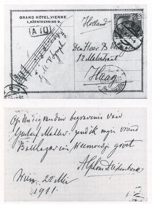 Year 1911. 22-05-1911. Postcard Alphons Diepenbrock (1862-1921) to Balthazar Huibrecht Verhagen (1881-1950) (in the Hague): ‘On the day of the funeral of Gustaaf Mahler I send my friend Balthazar a melancholy greeting’. On the front Diepenbrock wrote the funeral theme from the first part of Gustaf Mahler’s Symphony No. 5. Postcard Grand Hotel Vienne, I, Kartnerring No. 9, Vienna. See also Diepenbrock at: Gustav Mahler funeral.