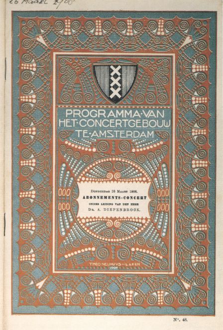 Year 1908. Program 26-03-1908. Gustav Mahler (1860-1911) Symphony No. 4 and Alphons Diepenbrock (1862-1921) Hymne to Rembrandt (composition 1906). Conductor Alphons Diepenbrock (1862-1921). Design program Theo Neuhuys, 1906.