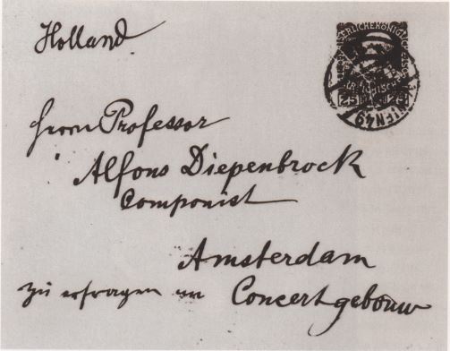 “…Gestern die Generalprobe war herrlich. Zweihundert Jungen aus der Schule unter Begleitung ihrer Lehrer (6 Stück) brüllen das Bim-Bam und ein famoser Frauenchor von 330 Stimmen! Orchester herrlich! Viel besser als in Crefeld. Die Violinen ebenso schön wie in Wien. Alle Mitwirkenden hören nicht auf zu applaudiren und zu winken. Dass du nicht dabeisein kannst! […] Einen sehr interessanten holländischen Musiker, namens Diepenbrock, der sehr eigenartige Kirchenmusik schreibt, habe ich hierkennen gelernt. -Die musikalische Kultur in diesem Lande ist stupend. Wie die Leute bloss zuhören können!