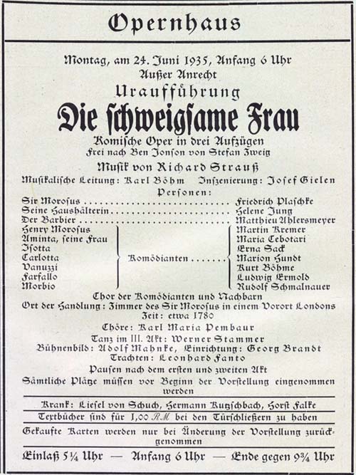 The fact that Zweig was a Jew was causing potential problems for the performance of the opera: in the summer of 1934 the Nazi press began to attack Strauss on this issue. Zweig recounts in his autobiography that Strauss refused to withdraw the opera and even insisted that Zweig’s authorship of the libretto be credited; the first performance in Dresden was authorized by Hitler himself. Subsequent research has shown that Zweig’s account is largely correct. We now know that there was an internal power struggle going on within the Nazi government.