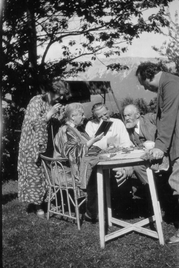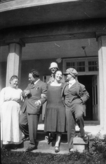 1933. House Alma Mahler Breitenstein am Semmering 1913-1937 (Werfelweg 6, Villa Mahler). Ida Gebauer (Schulli), Franz Werfel (1890-1945), unknown person, Alma Mahler (1879-1964).