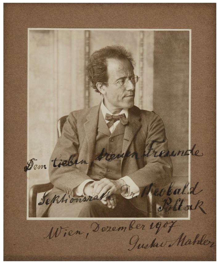 Year 1907. “Dem lieben, treuen Freunde, Sektionsrath, Dr. Theobald Pollak (1855-1912), Wien, Dezember 1907, Gustav Mahler”. Photo by Moritz Nähr of Vienna, showing the composer seated in the foyer of the Vienna Hofoper, overall size 17.5 x 15 cm, framed and glazed, photographer’s blind stamp on the image, Vienna, December 1907.