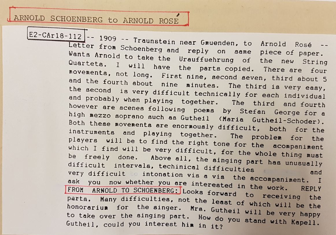 1909. Arnold Schoenberg (1874-1951) to Arnold Josef Rose (1863-1946). Translation. Mentioned is Marie Gutheil-Schoder (1874-1935). He describes each movement, and warns Rosé of the work’s difficulty, both in terms of individual technique and ensemble. Hopes to have Marie Gutheil-Schoder for the soprano. Arnold Rosé drafted his response on the bottom of the letter: he is looking forward to Schönberg’s latest work, but is certain that Gutheil would expect an honorarium and he is himself unable to find the money.