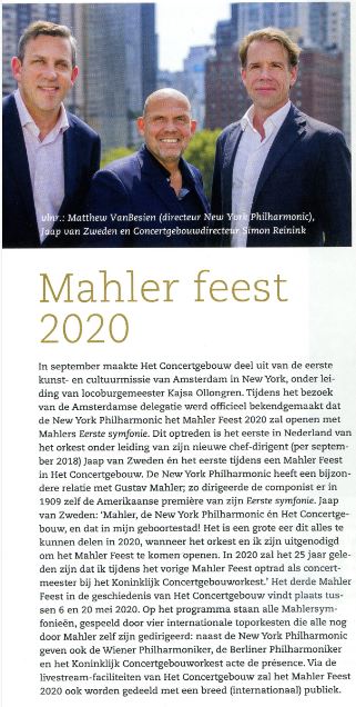 Translated from Dutch: Official publication in New York about the opening of the Gustav Mahler Festival 2020 Amsterdam ***** by the New York Philharmonic Orchestra (NYPO/NPO) with Symphony No. 1. This is the first performance of the New York Philharmonic Orchestra (NYPO/NPO) led by its new chief conductor Jaap van Zweden (1960) in Amsterdam and the first concert of the Gustav Mahler Festival 2020 Amsterdam *****. Jaap van Zweden (1960) is very enhousiast: “Gustav Mahler, the New York Philharmonic Orchestra (NYPO/NPO) and the Royal Concertgebouwl, and all that in my hometown!”.