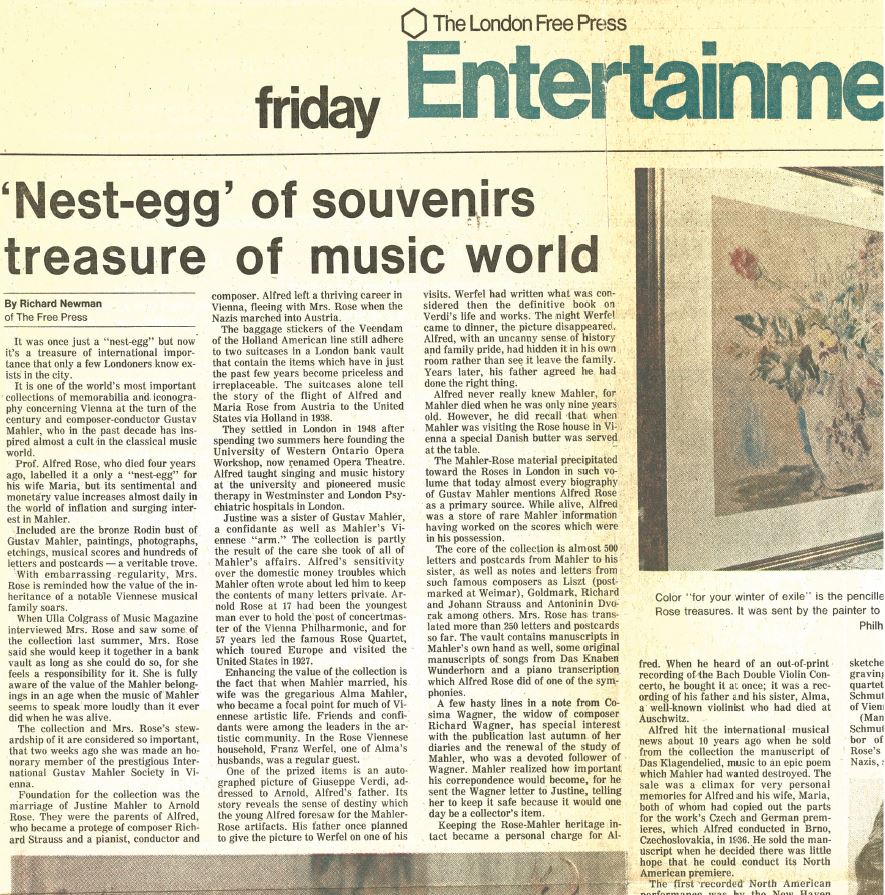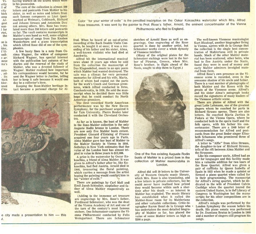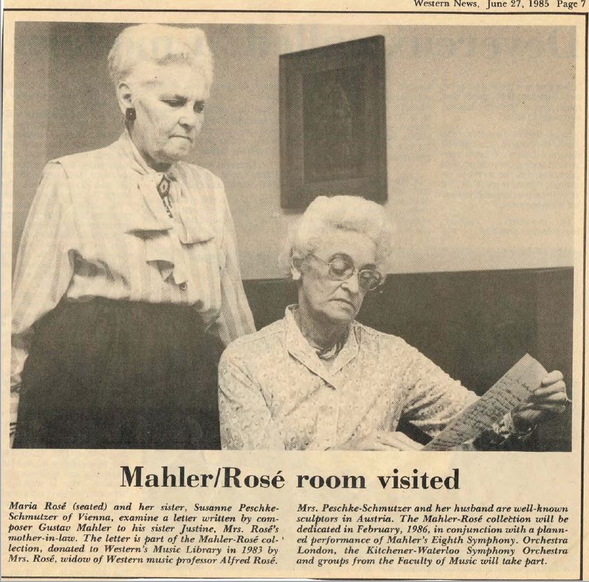 Maria Caroline Rosé-Schmutzer (1909-1999) and her sister. Alfred Rose collection 1983 The Gustav Mahler-Alfred Rosé Collection was donated to the Music Library of The University of Western Ontario in October 1983 by Maria Caroline Rosé-Schmutzer (1909-1999), widow of Professor Alfred E. Rosé, who was the nephew of composer Gustav Mahler and the son of Justine Mahler Rosé and Arnold Rosé (concertmaster of the Vienna Philharmonic Orchestra and leader of the Rosé String Quartet). See: Gustav Mahler - Alfred Rosé Collection. |
