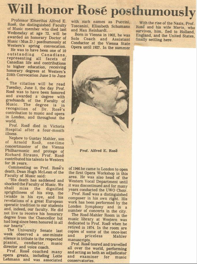 Alfred Eduard Rose (1902-1975). In 1946 Rosé directed a summer workshop in opera at the Western Conservatory of Music, London, Ont, and in 1948 he moved to that city to teach at the University of Western Ontario. In 1973 he retired with the rank of professor emeritus. In 1950 he became organist-choirmaster at St Martin's Church. He was a pioneer in music therapy and set up programs at Westminster Hospital in 1952 and the London (Ont) Psychiatric Hospital in 1956. As a composer Rosé's most productive years were the 1920s and 1930s. Of his many songs 10 were published (1927-1928, Doblinger, Krämer) in Austria. His Adagio for cello and orchestra (1941) was premiered in 1974 in London, Ontario. Other works in larger forms are Sonata in A (1936) for piano and Tryptichon (1937) for large orchestra. Rosé's connection with Mahler and his extensive collection of scores and letters (the latter now at the University of Western Ontario) made him a valued source of information for researchers.
