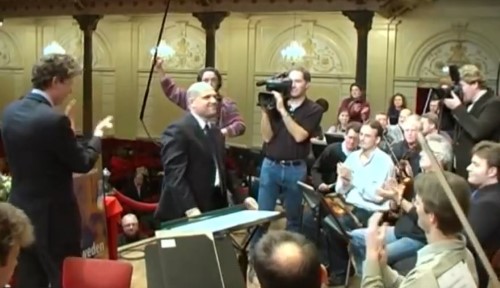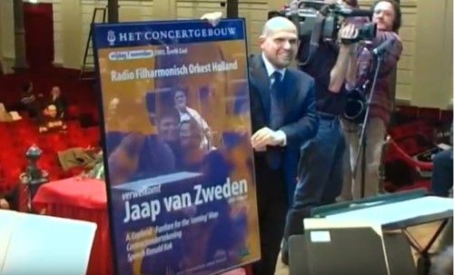 As an introduction to the ceremony, brass players and percussionists, led by assistant conductor Benjamin Wallfisch, played the Fanfare for the ‘coming’ Man by Aaron Copland. After several introductory words from orchestra manager Stefan Rosu, Van Zweden signed the agreement that connected him to the orchestra as chief conductor from 01-01-2005. Then he was festively addressed by the chairman of the orchestra committee Ronald Kok. The official part was completed with the unveiling of a life-sized poster welcoming the new chef.