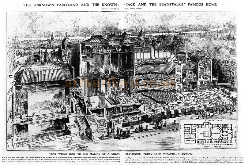 London. Theatre Royal Drury Lane. A sketch of the original auditorium, stage, FOH, and backstage of the Fourth Theatre Royal Drury Lane in 1910 during the run of the Pantomime ‘Jack and the Beanstalk’ – Illustrated London News 1910.