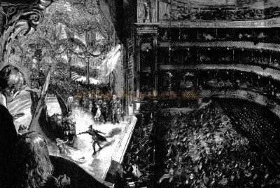 1892. London. Theatre Royal Drury Lane. A sketch of the original auditorium and stage of the Fourth Theatre Royal Drury Lane as seen from the uppermost box during a performance of ‘Little Bo Peep, Little Red Riding Hood, and Hop-O’ My Thumb’ in 1892. The scene on stage was ‘The Grand Hall of a Million Mirrors at the Prince’s Palace – From the Graphic, 31st December 1892.