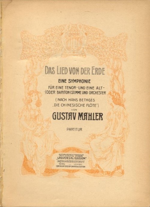 Das Lied von der Erde. Title page Das (Trink) Lied von der Erde. … zum Chinesichen der 8. Jahrhundert n. Ch. Symphony fur eine Tenor und Alt Stime un Orchester. (… Chinese of the 8th century AD, Symphony for a tenor and alto and orchestra.)