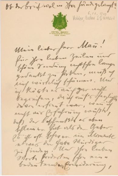 How could he know that? This question can now be answered on the basis of a letter discovered by the opera and concert singer Frauke May-Jones in the Thomas Mann Archive in Zurich. It is Mahler’s only letter to Thomas Mann. Mahler had traveled to America at the end of October 1910 for his fourth season in New York. It should be his last. Shortly after arrival he wrote on the stationery of the hotel, where Alma and Gustav Mahler occupied a suite, the Hotel Savoy, the following letter of thanks.