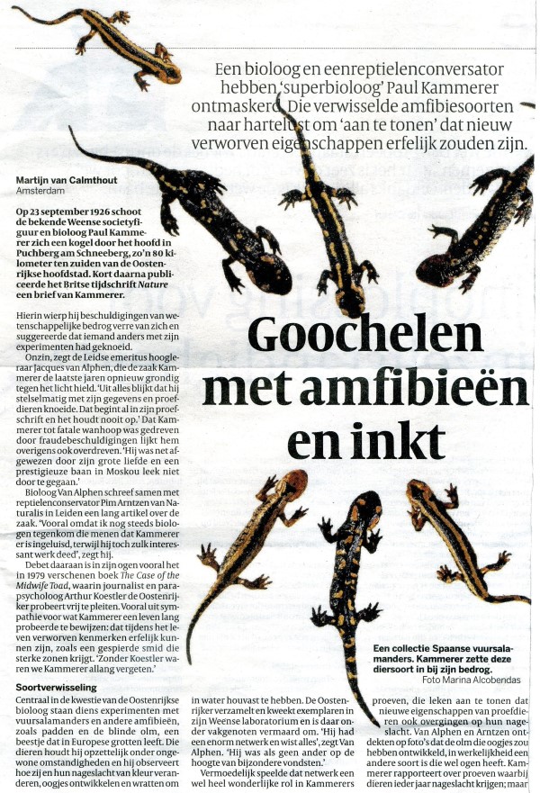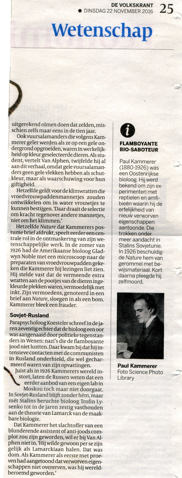 Paul Kammerer (1880-1926), newspaper article in De Volkskrant, the Netherlands 22-11-2016. “Juggle amphibians and ink”. (Dutch 1/2)