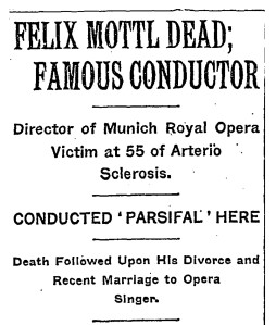 In June 1907 he cut some player piano rolls with Welte-Mignon, including his own piano transcription of the Prelude, the Love Duet and Brangäne’s Warning from Tristan. He suffered a heart attack on 21 June 1911 while conducting his 100th performance of Tristan in Munich. He was taken to a hospital where he died 11 days later on 2 July, but not before marrying his longtime mistress, the soprano Zdenka Fassbender.