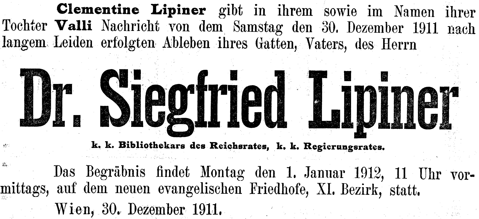 30-12-1911 Mahler and Lipiner died in 1911 within a few months of each other.