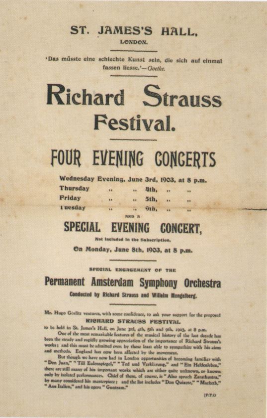 Year 1903. Announcement of the Richard Strauss Festival in London. Richard Strauss (1864-1949), Willem Mengelberg (1871-1951) and Amsterdam Royal Concertgebouw Orchestra (RCO). St. James’s Hall. 03-06-1903, 04-06-1903, 05-06-1903, 08-03-1903 and 09-06-1903.