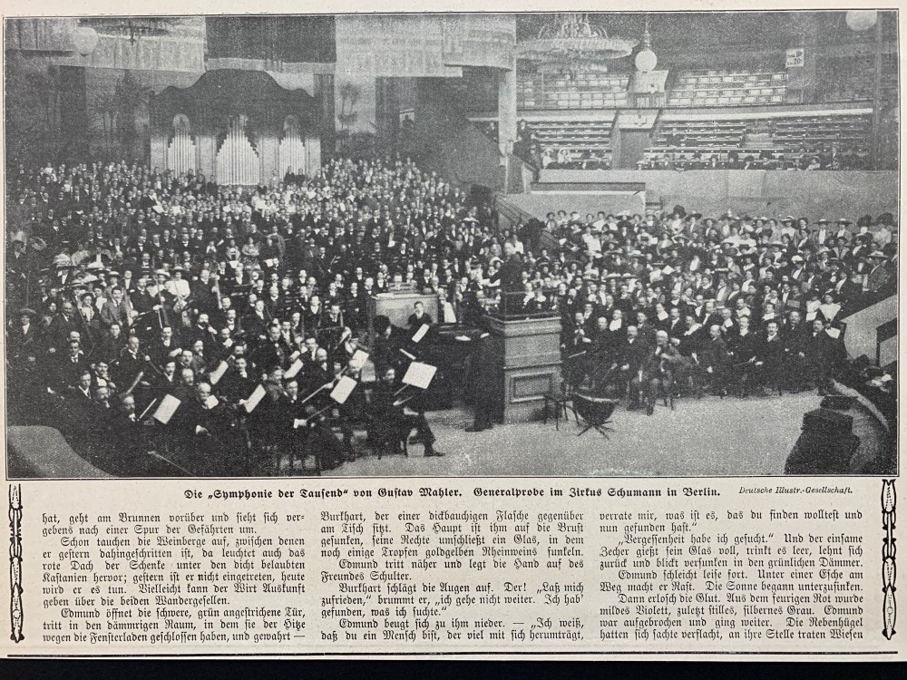 1912. Gustav Mahler legacy. Copy of a newspaper (16-05-1912) detailing the rehearsal in Munich for the premiere of Symphony No. 8 in Zirkus Schumann in Berlin. 1912 Concert Berlin 17-05-1912 – Symphony No. 8.